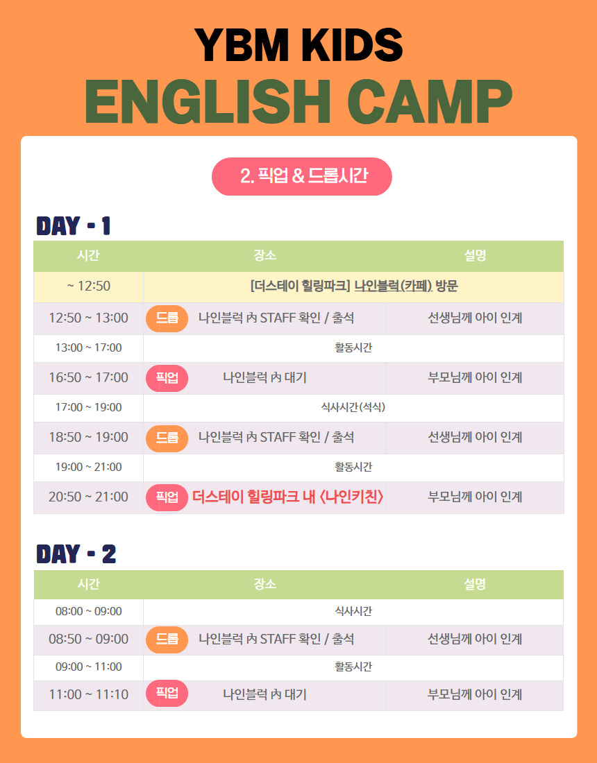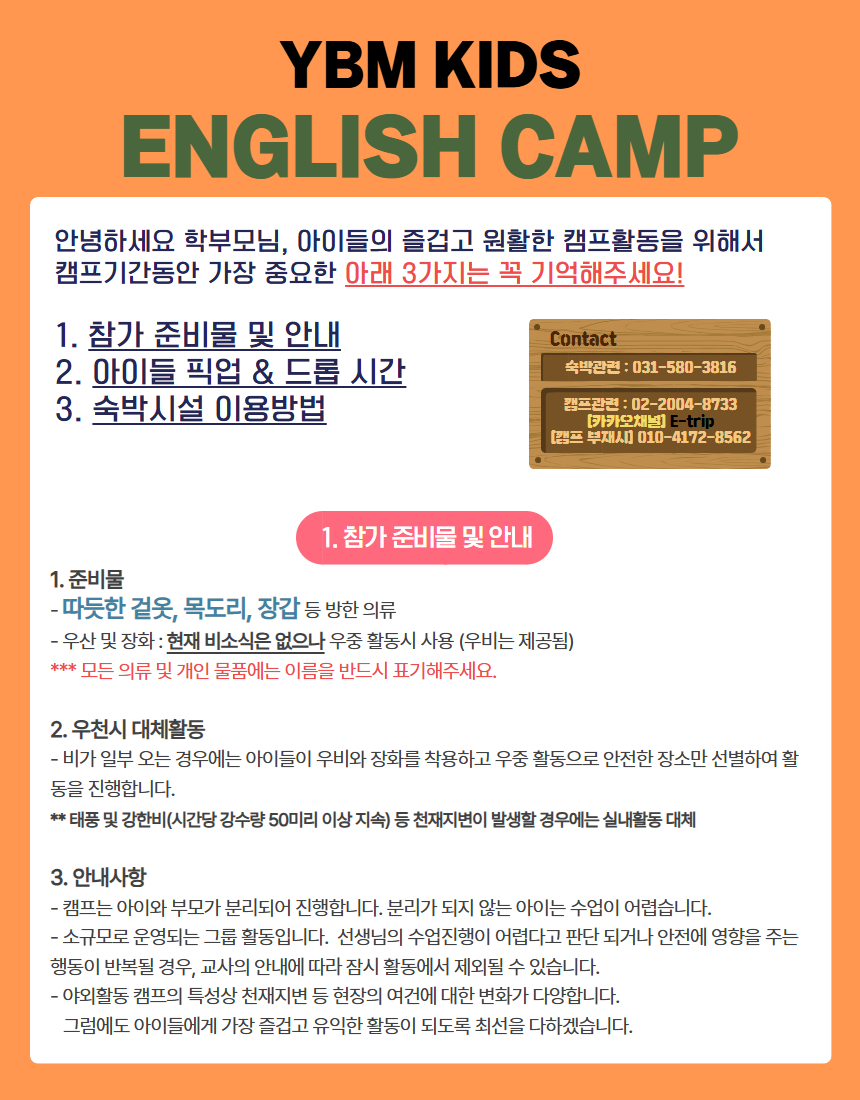 [ YBM KIDS ENGLISH CAMP 최종안내]안녕하세요 학부모님, 금주 다가오는 캠프의 원활한 참여를 위해 아래 상세내용을 확인 부탁드립니다. -안내서 다운로드 링크- https://drive.google.com/file/d/1jIDQkn7xSiiiTGdbhchQntfU9n16zWSb/view?usp=drive_link